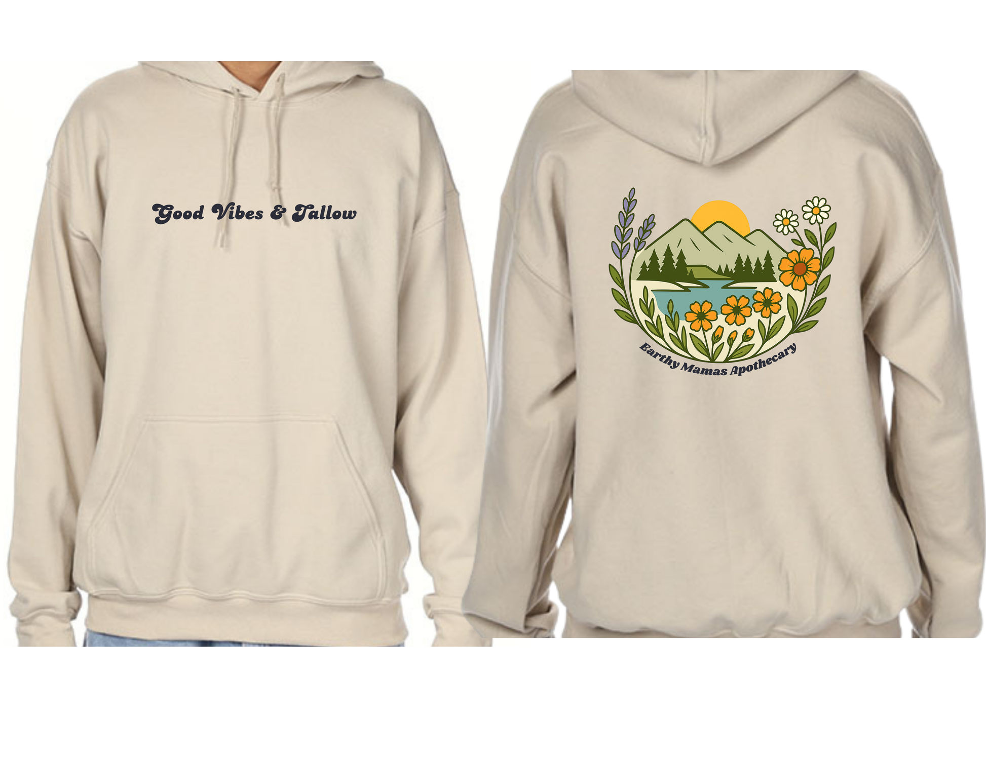 With “Good Vibes & Tallow” printed on the front and our signature Earthy Mamas mountain-and-floral artwork on the back, this hoodie celebrates everything we stand for: slow living, clean ingredients, and good energy from the Earth.